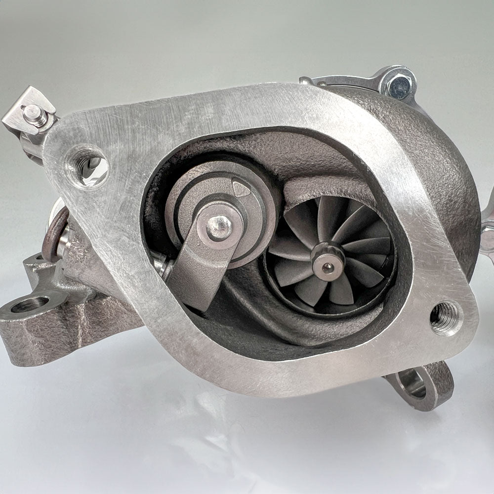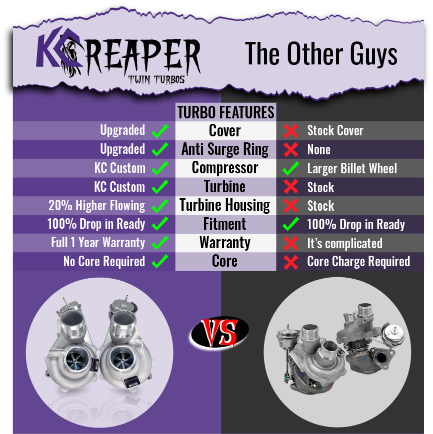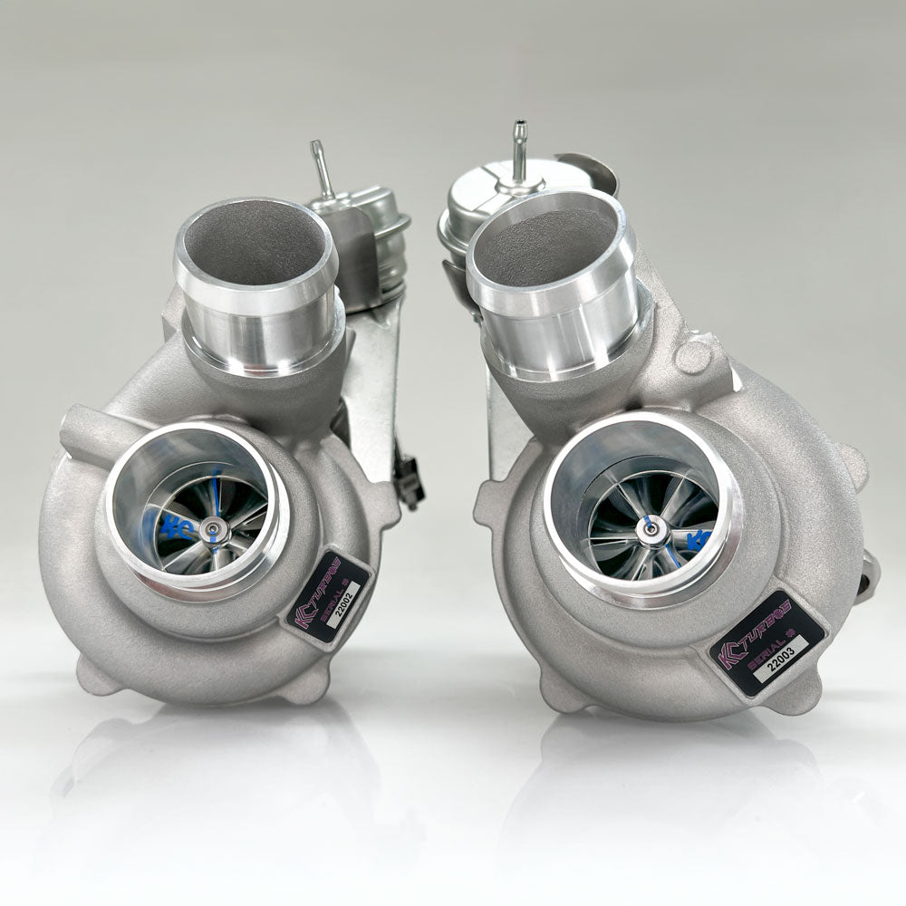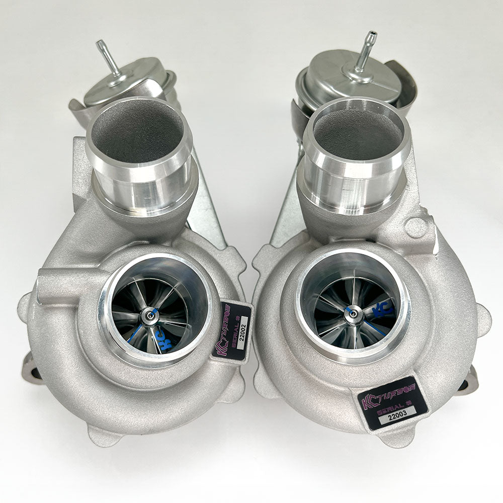 The KC Reaper 500 Twin Turbos for the 3.5 EcoBoost have undergone extensive research and development, resulting in enhanced performance and power. We utilized our Ford Powerstroke Turbos as a baseline, and then improved upon them by redesigning the compressor and turbine wheels and creating new, more efficient turbine housing and compressor covers.